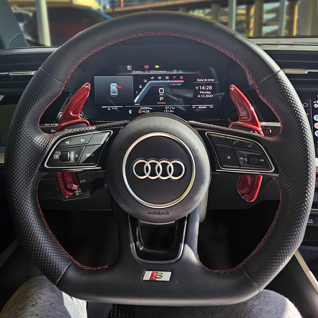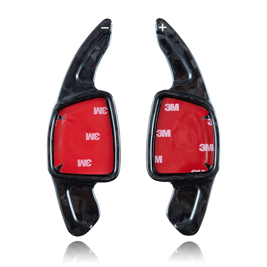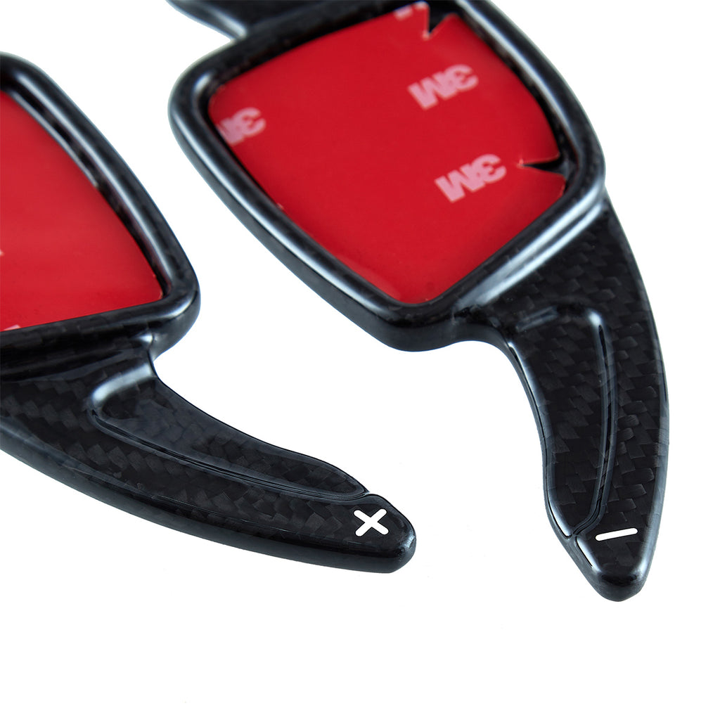 Transform your Audi's shifting feel and elevate your driving experience with these fully carbon fiber S Tronic paddle shifter extensions. Designed to provide an extended reach, they allow you to shift gears effortlessly, no matter where your hand may be positioned on the steering wheel.