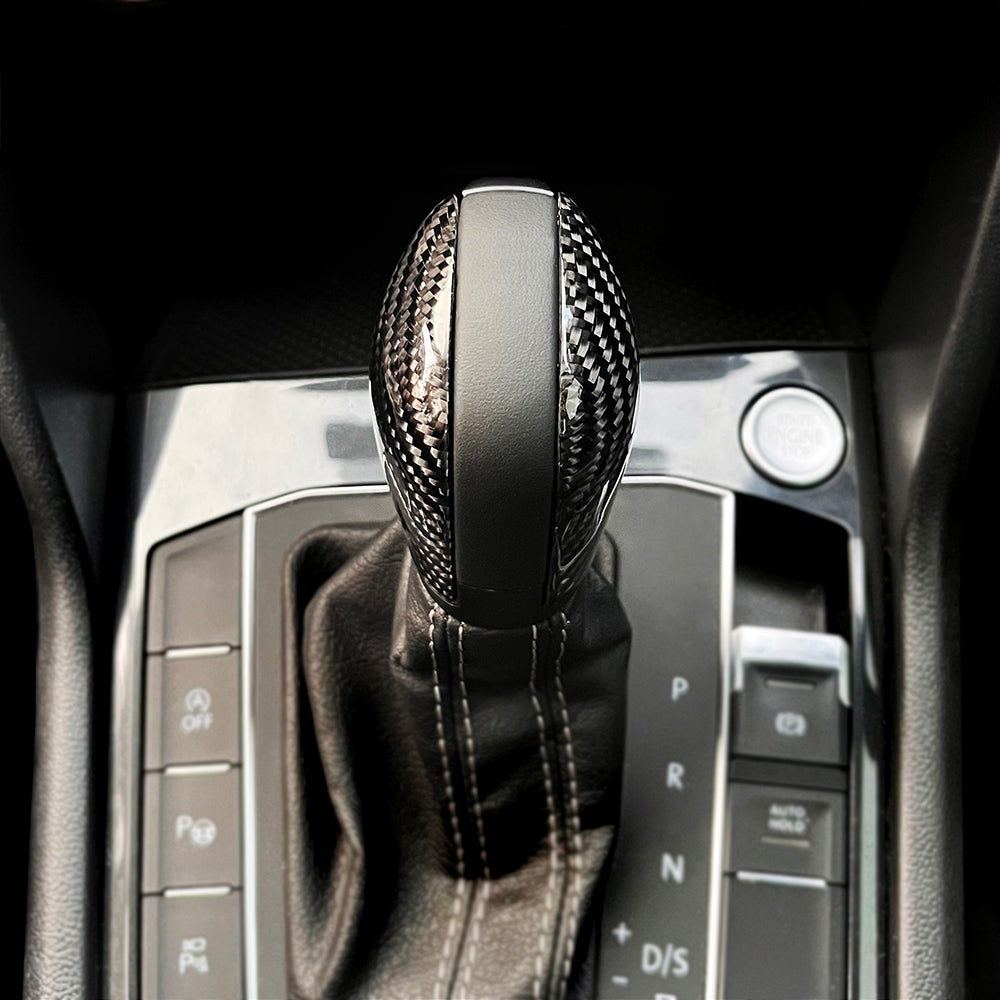 Enhance your interior with the Carbon Fiber DSG Shifter Knob Upgrade, designed to replace the factory shift knob covers on most 2010–2021 Volkswagen DSG models.