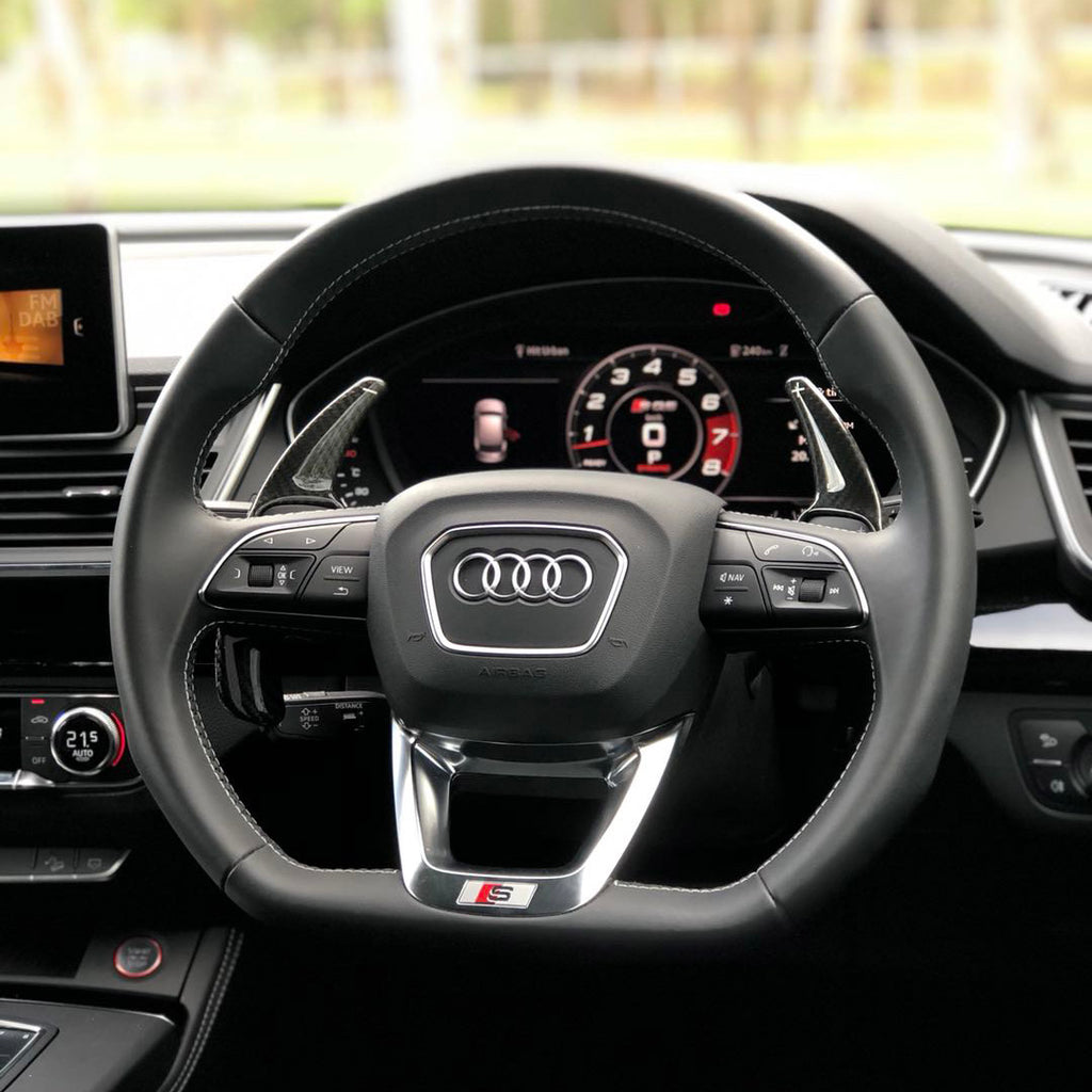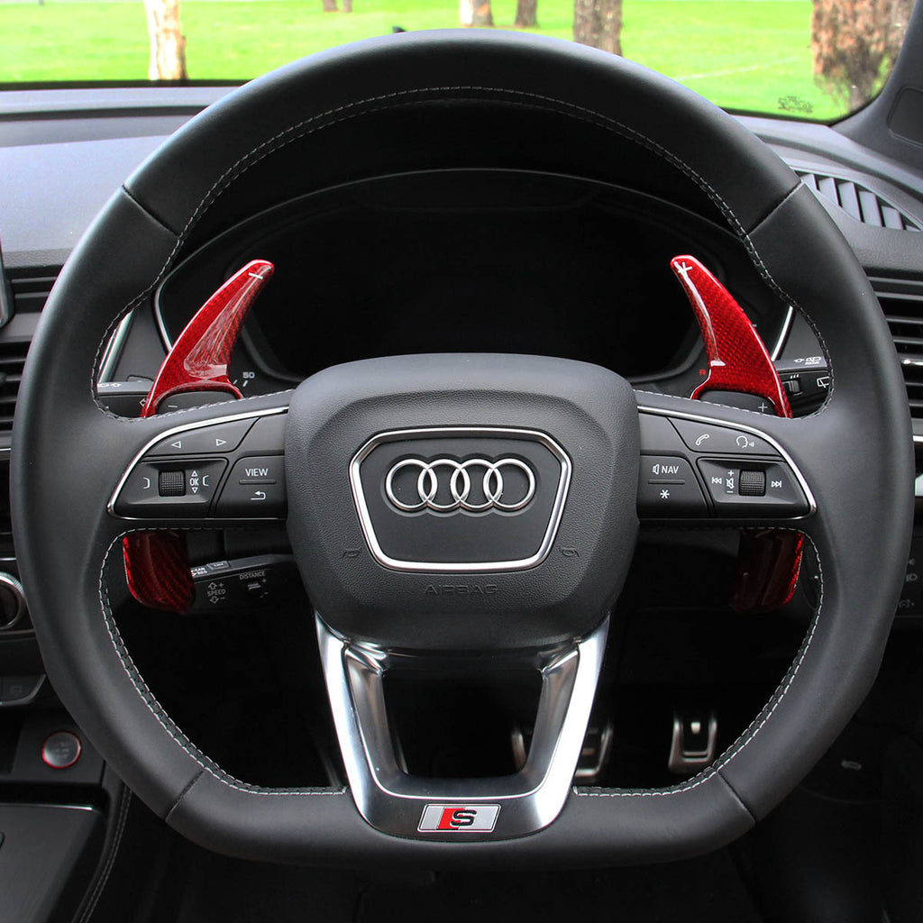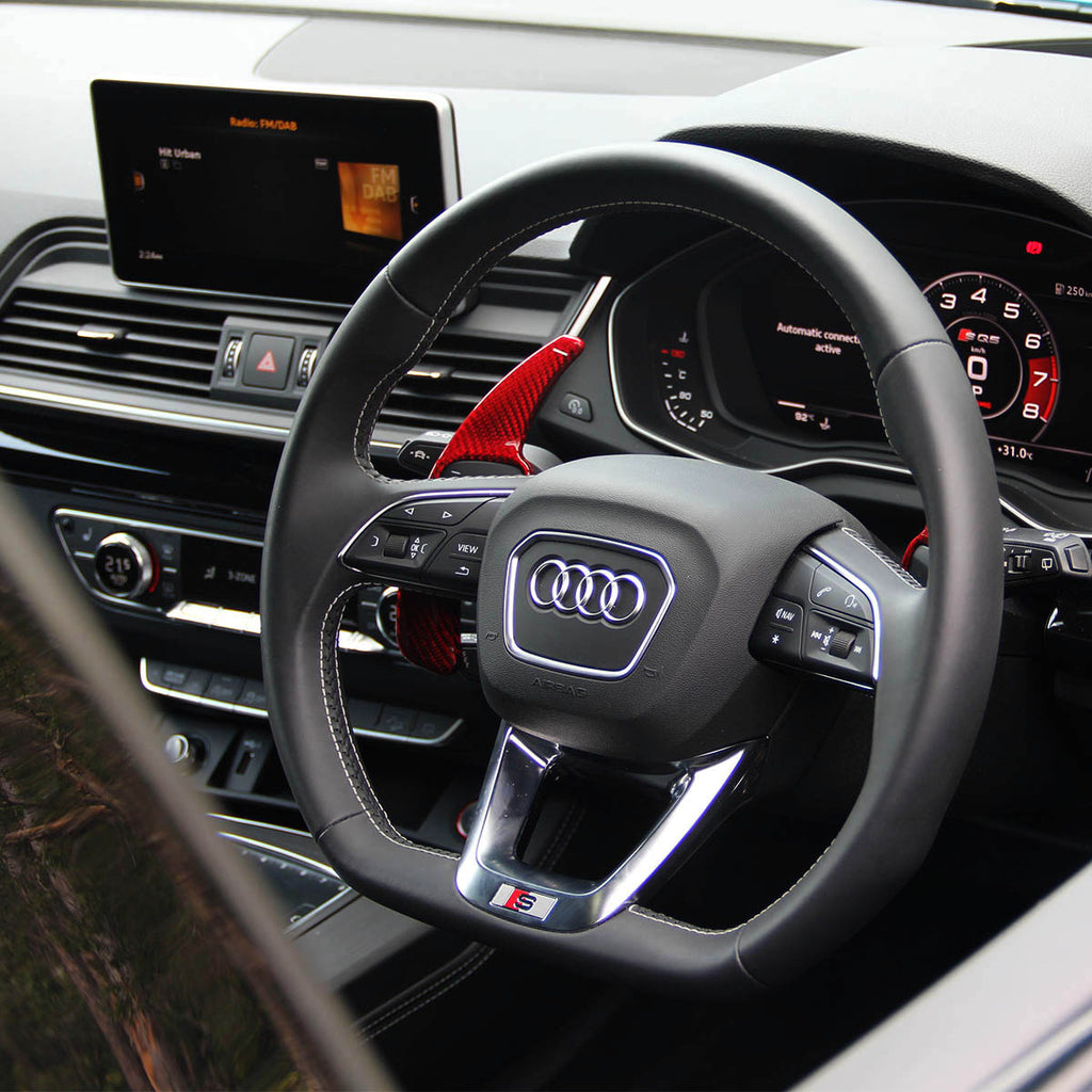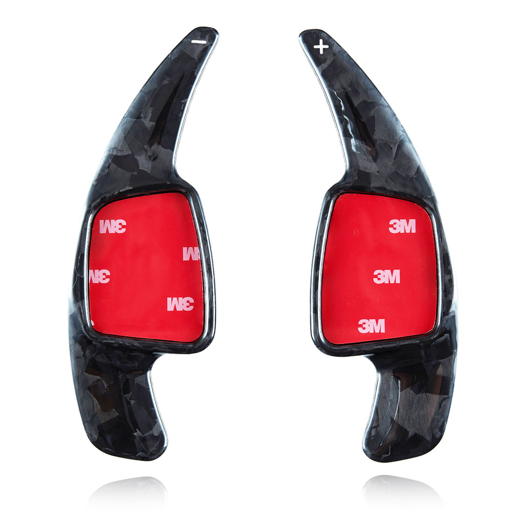 Transform your Audi's shifting feel and elevate your driving experience with these fully carbon fiber S Tronic paddle shifter extensions. Designed to provide an extended reach, they allow you to shift gears effortlessly, no matter where your hand may be positioned on the steering wheel.